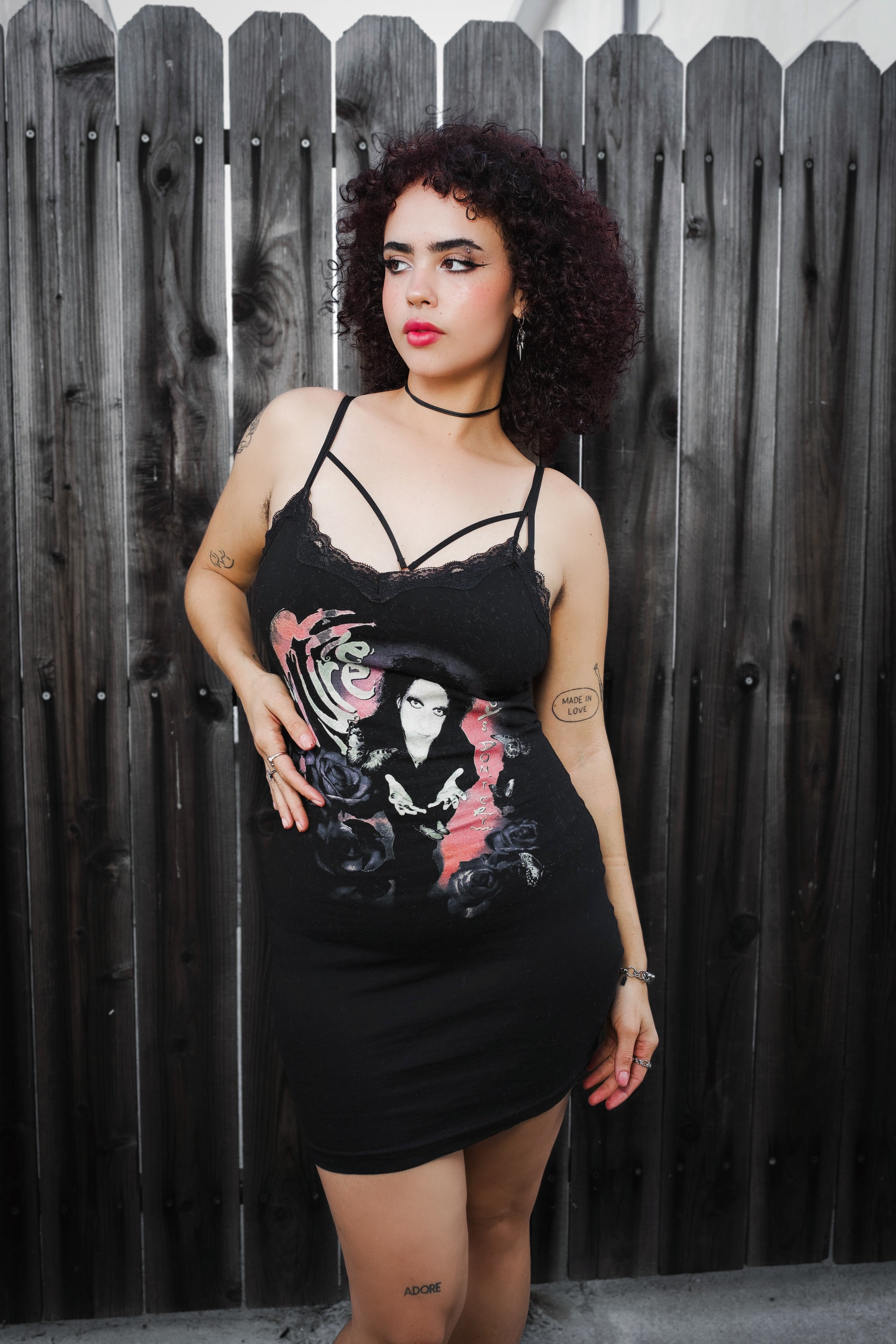 Elvira X Fangoria Magazine Cover Lace Strap Dress! Altered from a large licensed men's t-shirt. Black lace V-cut neckline with black adjustable straps. Sizes // Measurements: XS: bust...