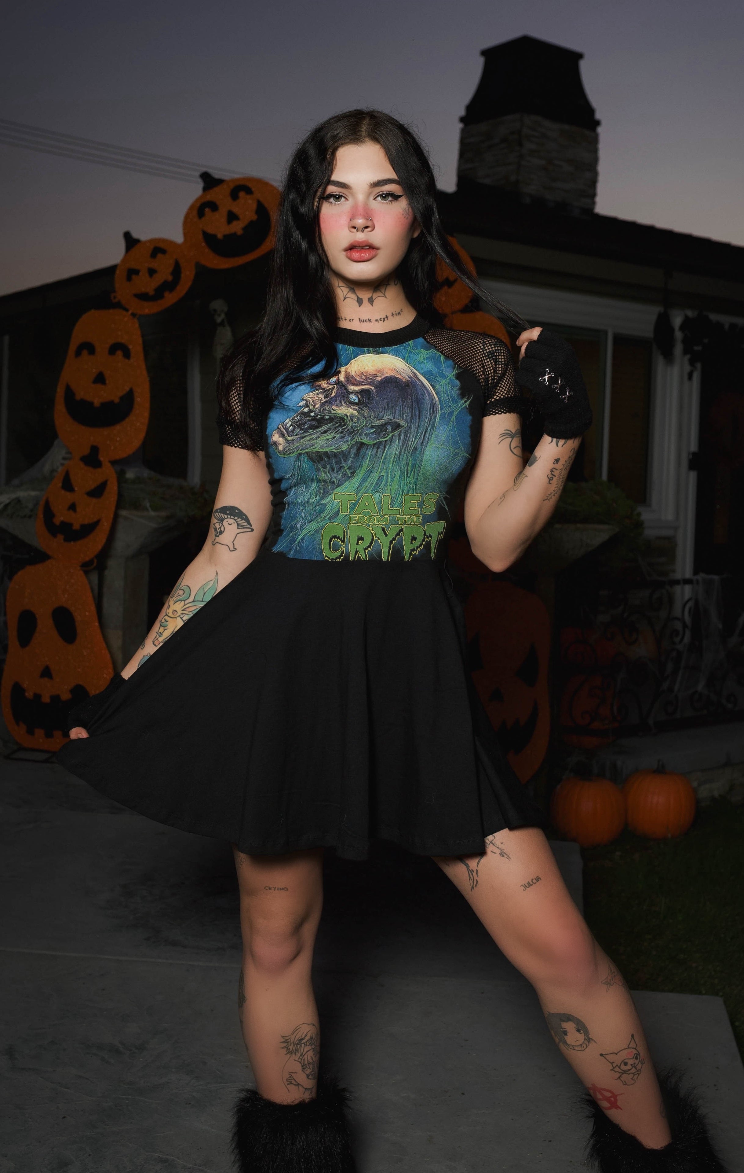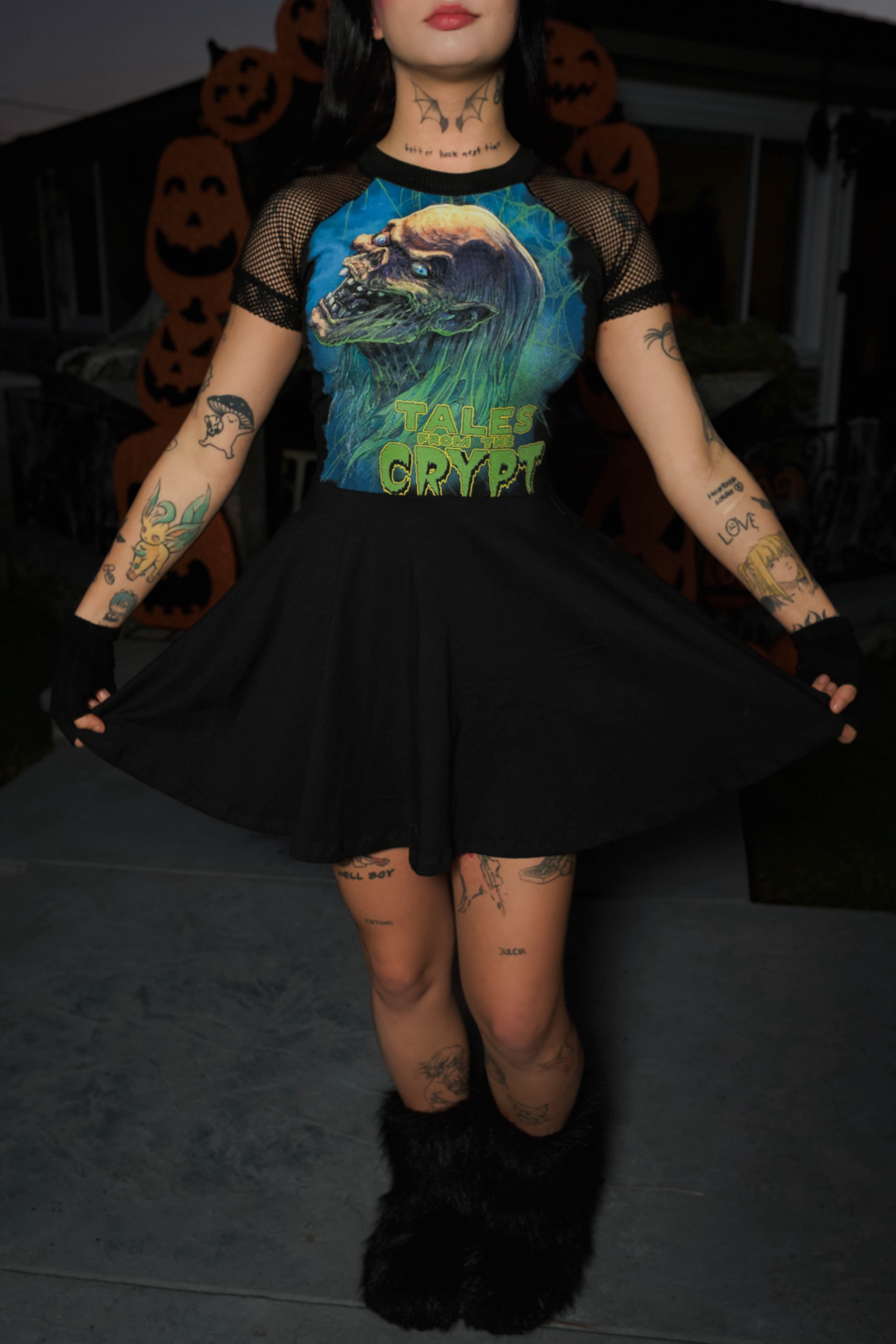 Tales from the Crypt Fishnet Baby Doll Dress! Professionally sewn. Altered from a large men's t-shirt. Super soft cotton. Short baseball fishnet-style sleeves. Round neckline. Back zipper. Hits above the...