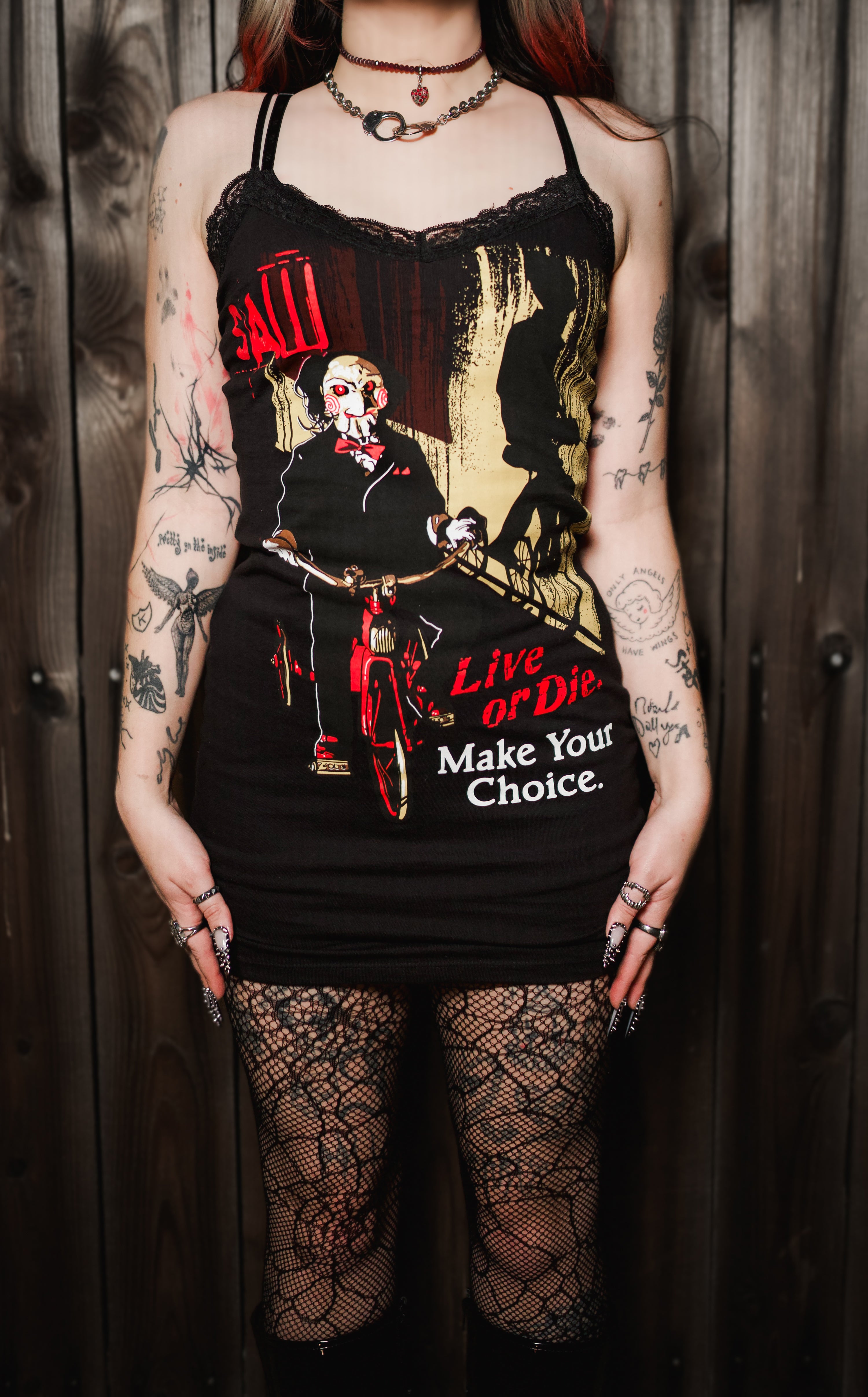 Halloween Lace Strap Dress! Altered from a large licensed men's t-shirt. Lace V-cut neckline and straps. Sizes // Measurements: XS: bust 30 - waist 24 - hips 34 Small: bust 34...
