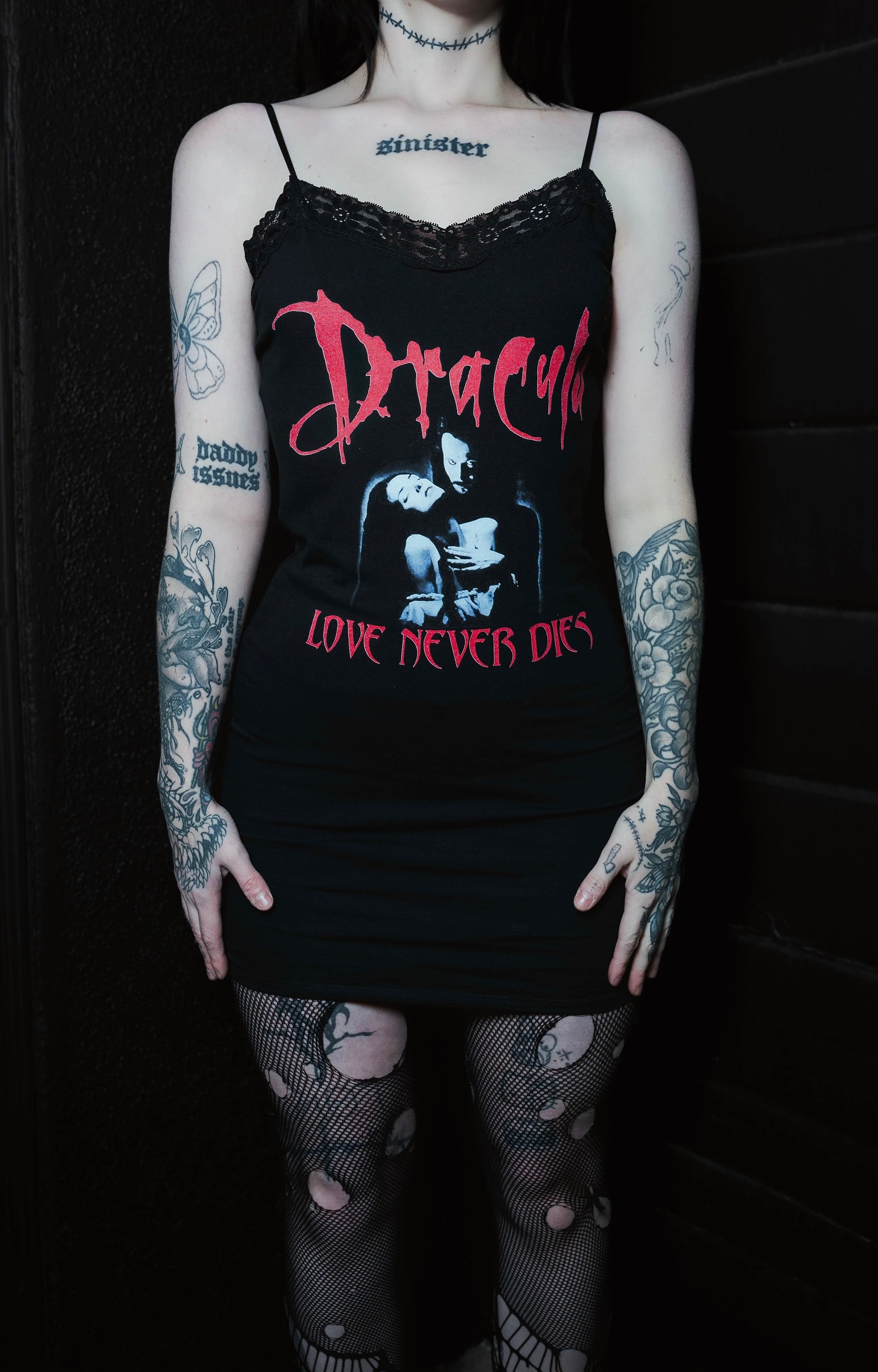 Return of the Living Dead Lace Strap Dress! Altered from a large licensed men's t-shirt. Black lace V-cut neckline with black adjustable straps. Sizes // Measurements: XS: bust...