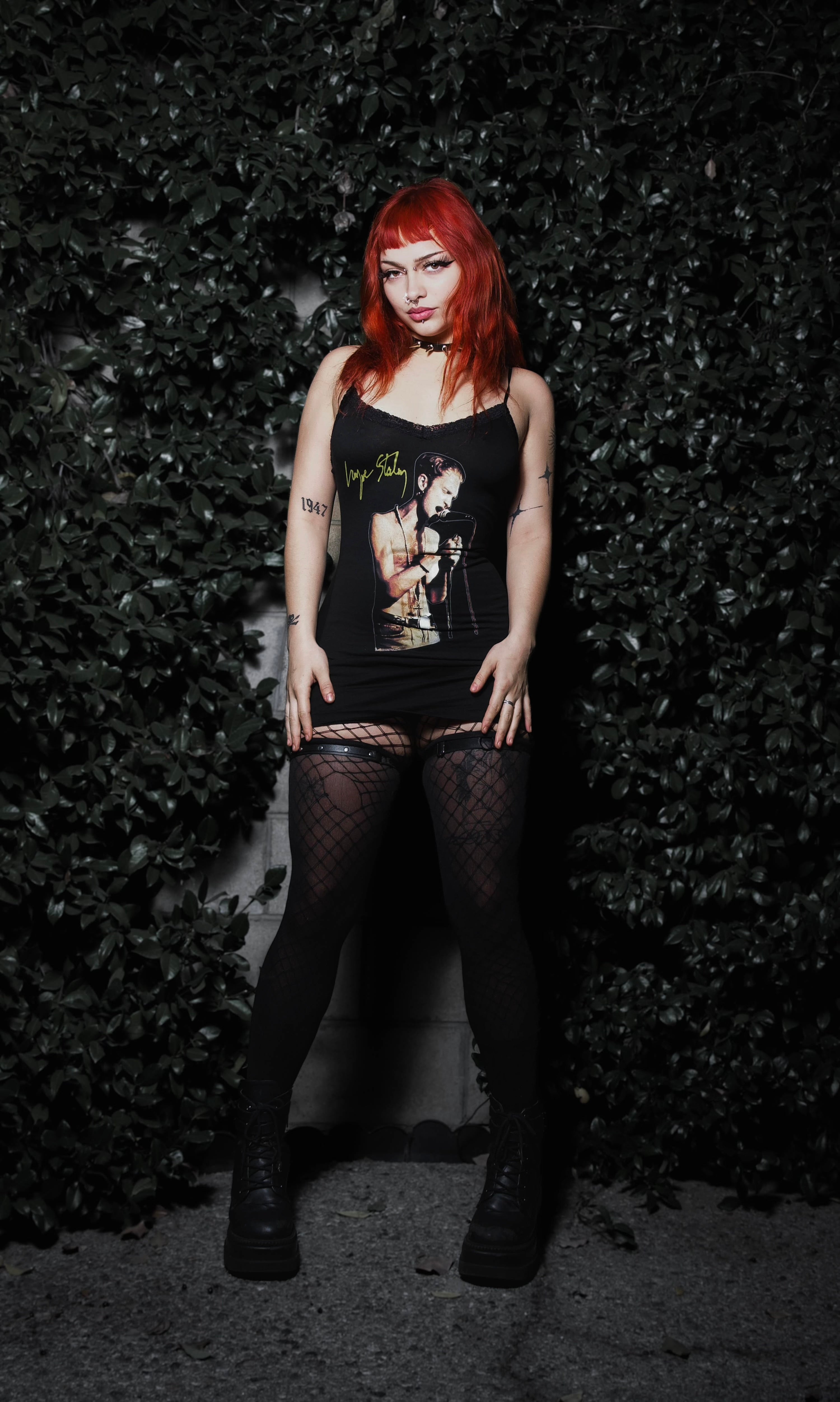 Christian Death Fishnet Dress! Professionally sewn. Altered from a large licensed men's t-shirt. Soft stretchy fishnet sleeves. Sizes // Measurements: XS: bust 30 - waist 24 - hips 34 Small:...