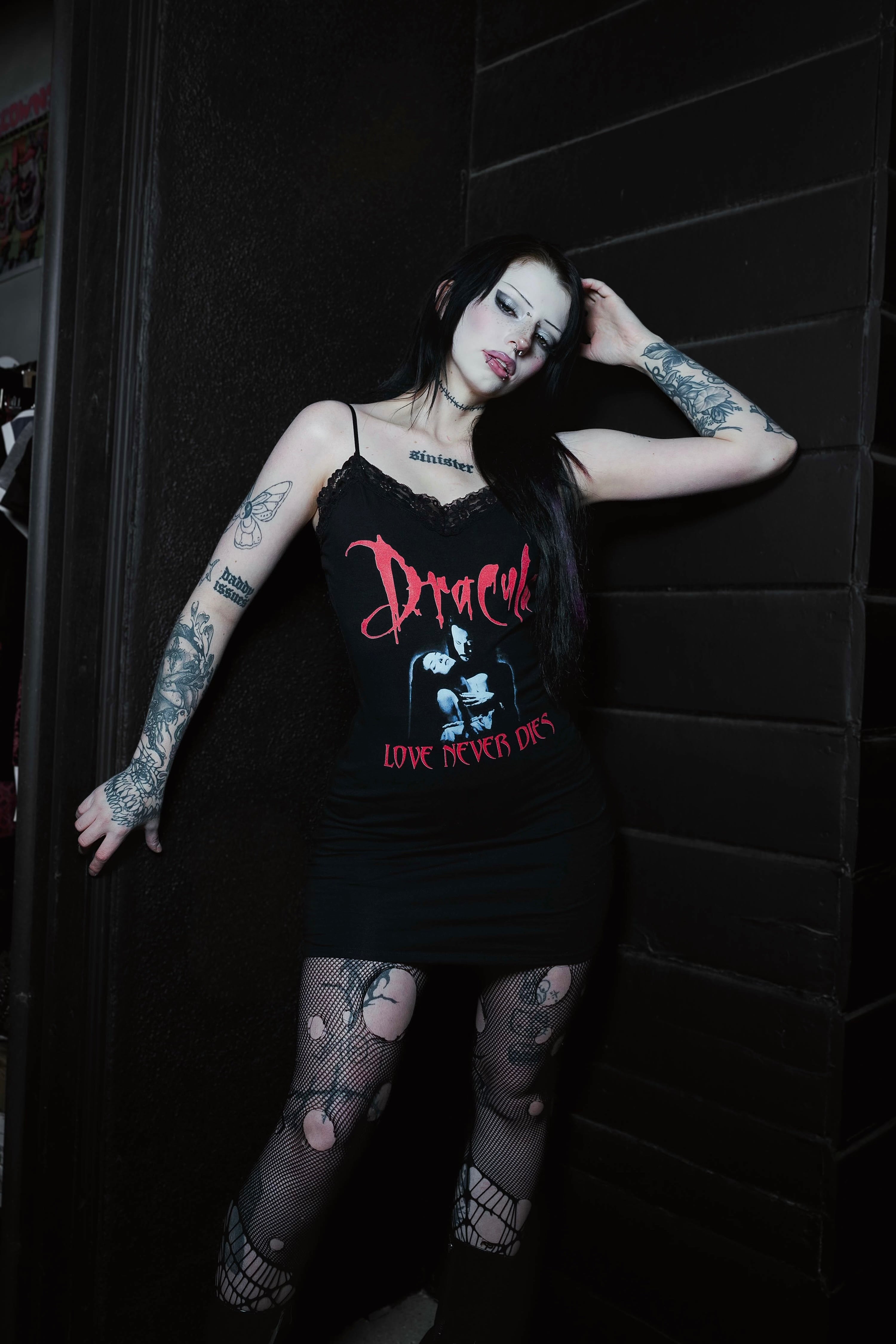 Dracula Lace Strap Dress! Altered from a large men's t-shirt. Fully lined and professionally finished with serged seams. Lace V-cut neckline and straps. Sizes // Measurements: XS: bust 30 -...