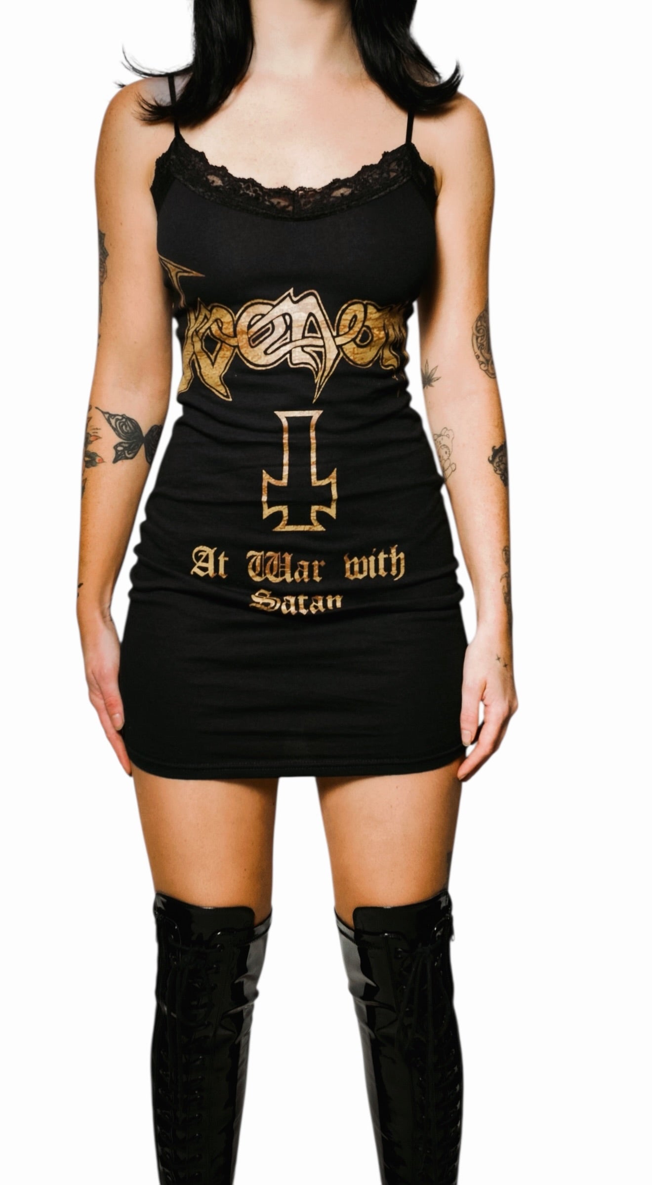 Mercyful Fate Lace Strap Dress! Altered from a large licensed men's t-shirt. Lace V-cut neckline and adjustable straps. Sizes // Measurements: XS: bust 30 - waist 24 - hips...