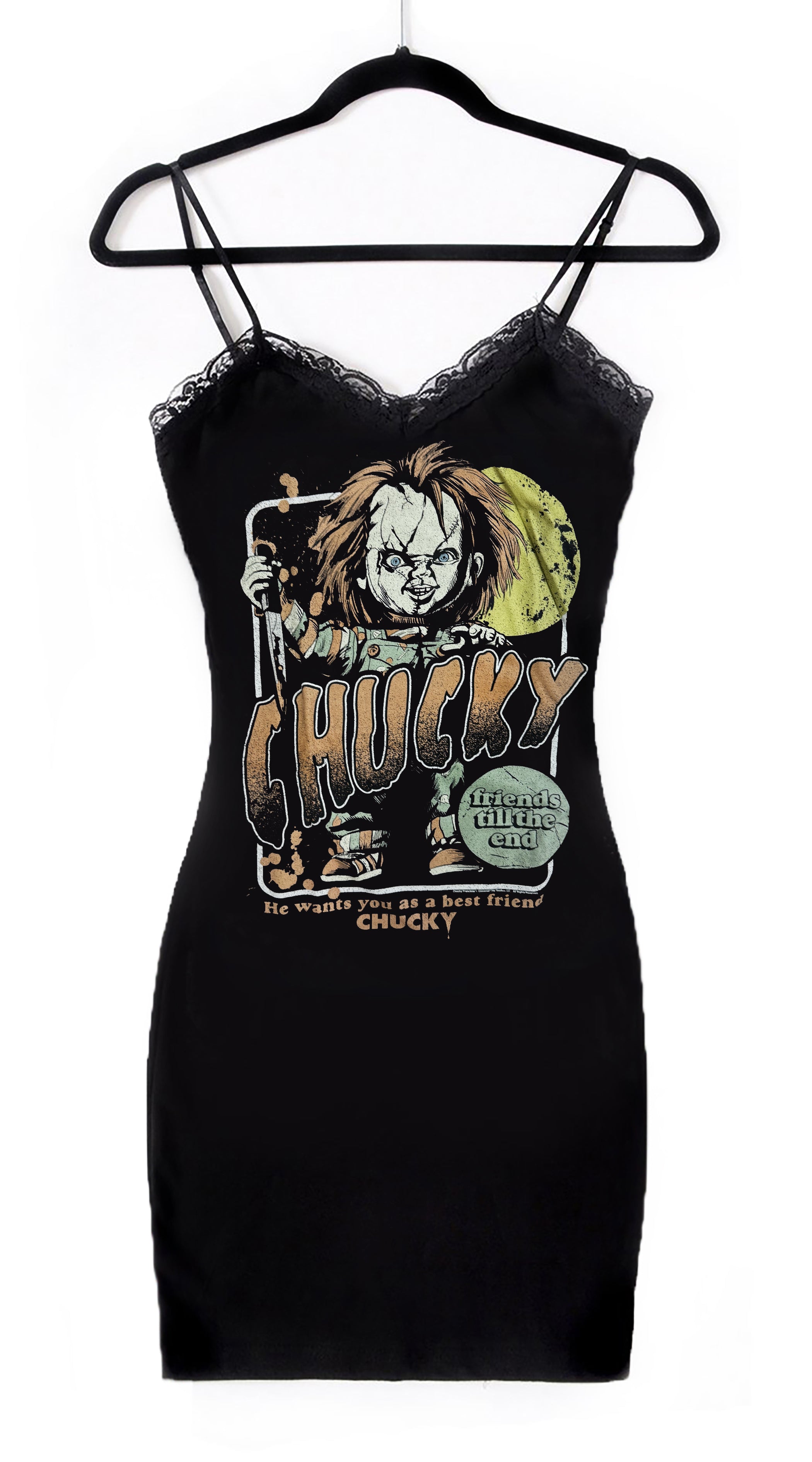 Chucky Lace Strap Dress ! Altered from a large licensed men's t-shirt. Lace V-cut neckline and straps. Sizes // Measurements: XS: bust 30 - waist 24 - hips 34 Small: bust...