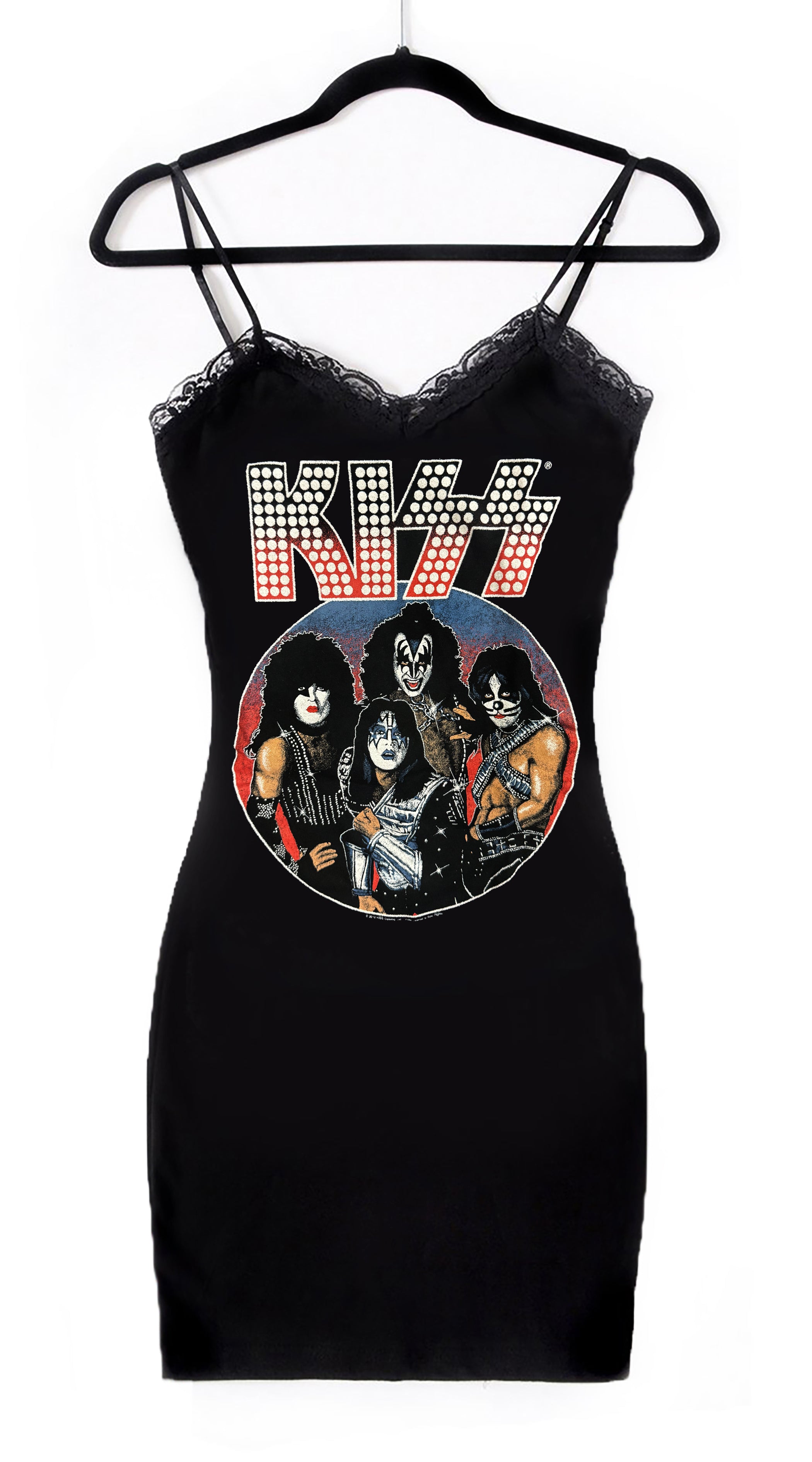 Kiss Lace Strap Dress! Altered from a large licensed men's t-shirt. Black lace V-cut neckline with black adjustable straps. Only 1 made! One of a kind! Sizes //...