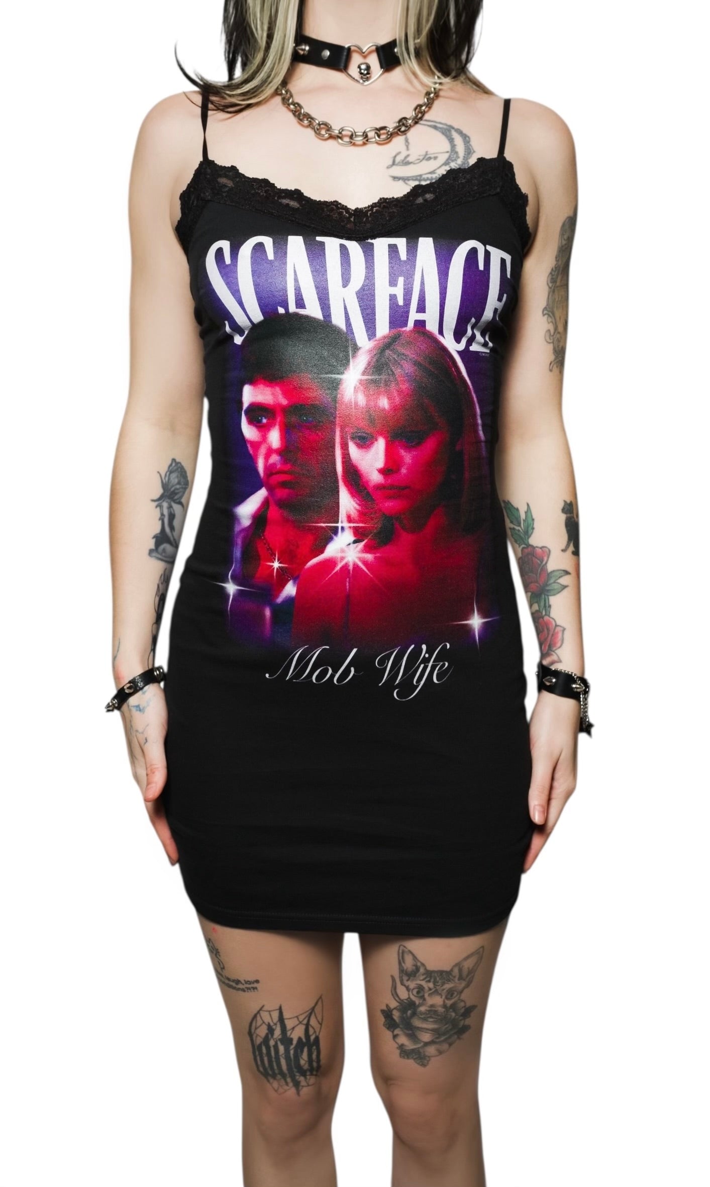 Scarface Lace Strap Dress! Altered from a large licensed men's t-shirt. Black lace V-cut neckline with black adjustable straps. Sizes // Measurements: XS: bust 30 - waist 24...