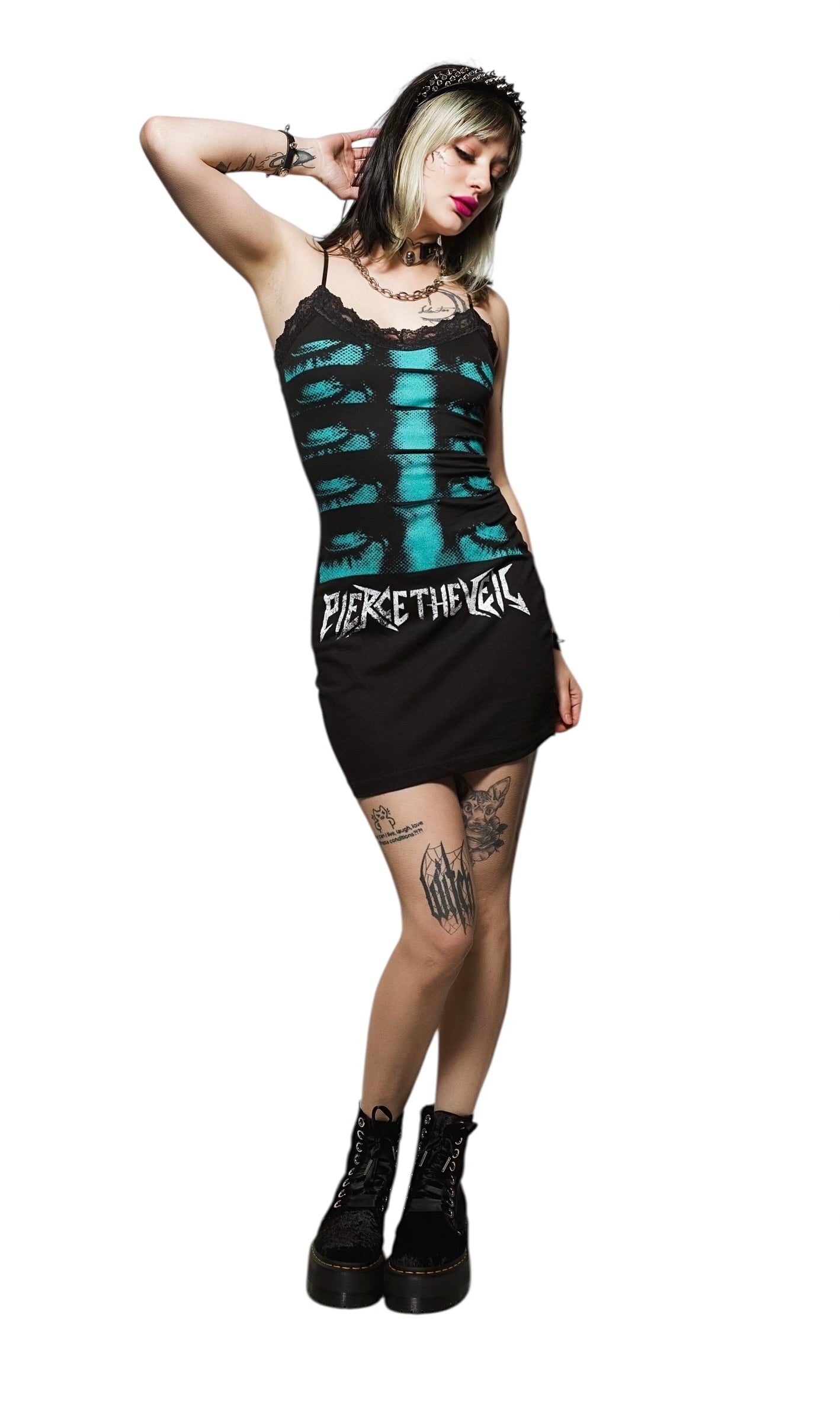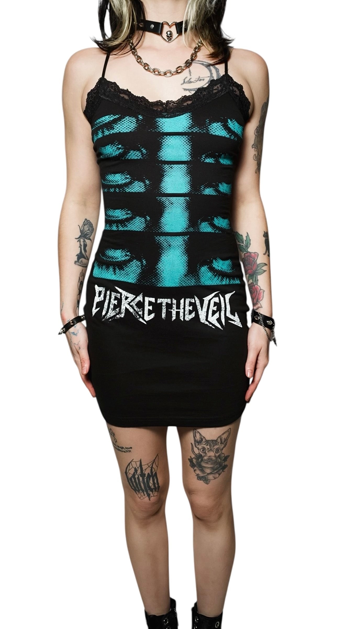 Pierce The Veil Lace Strap Dress! Altered from a large licensed men's t-shirt. Black lace V-cut neckline with black adjustable straps. Sizes // Measurements: XS: bust 30 -...