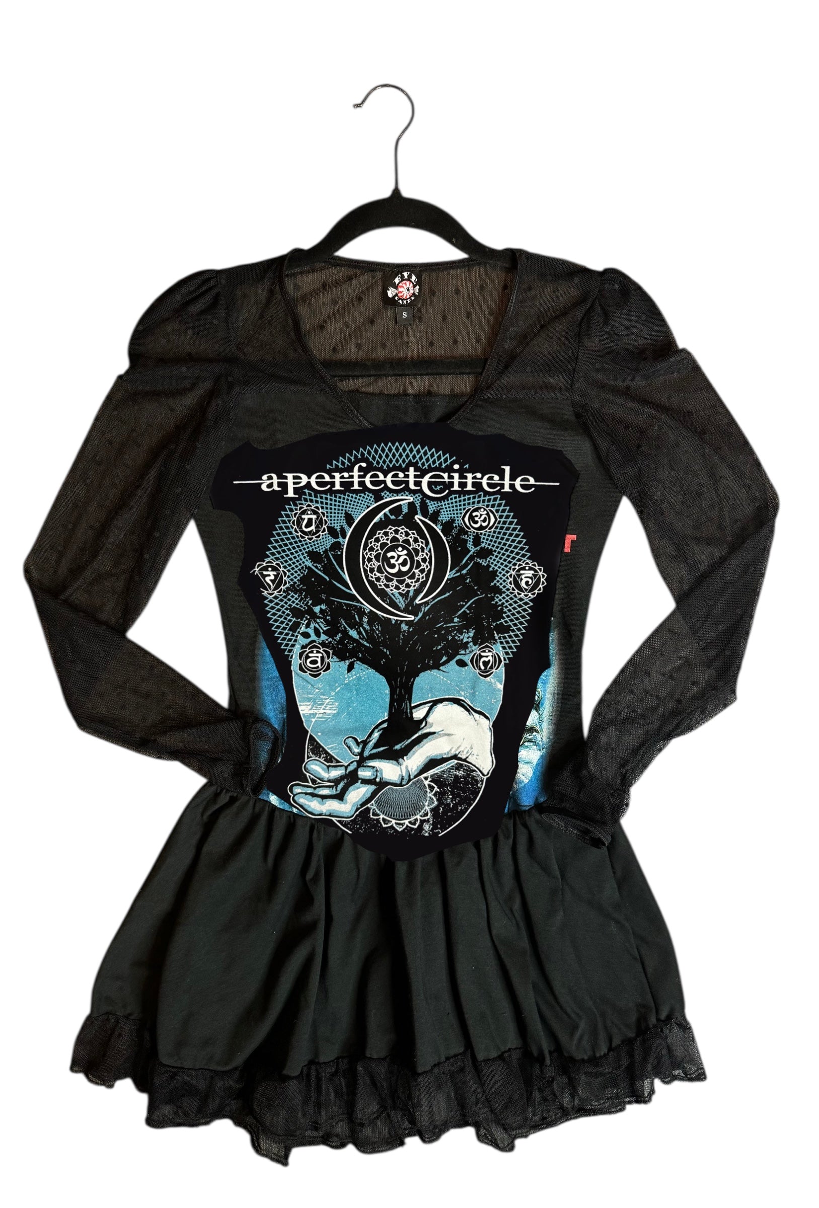 A Perfect Circle Lace Strap Dress! Altered from a large licensed men's t-shirt. Lace V-cut neckline and straps. Sizes // Measurements: XS: bust 30 - waist 24 - hips 34 Small:...