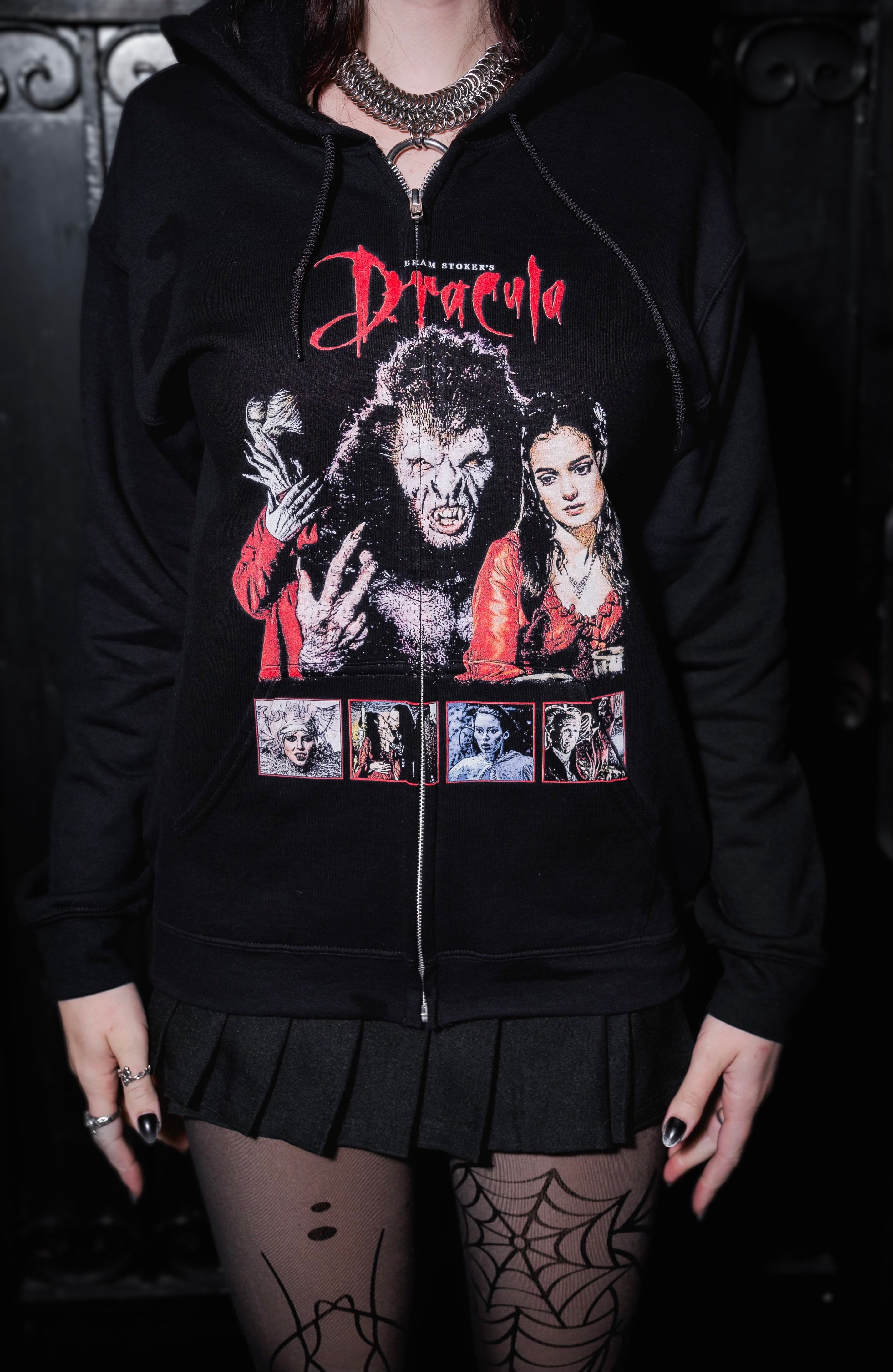 Dracula Zipped Hoodie (Unisex) Super soft, warm, and lightweight! Manufactured and printed in the USA. The model is wearing a small. 🖤 Artwork by: @vampbaddie