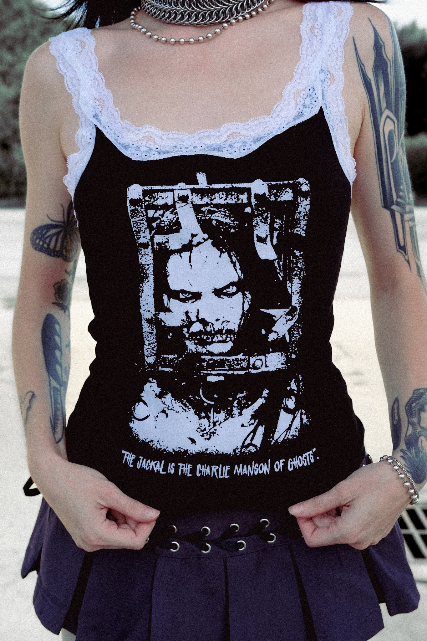 This tank top features a super-soft, stretchy ribbed construction, white lace shoulder straps, and 13 Ghosts - The Jackal graphic on the front. Professionally handmade by us in Los Angeles,...