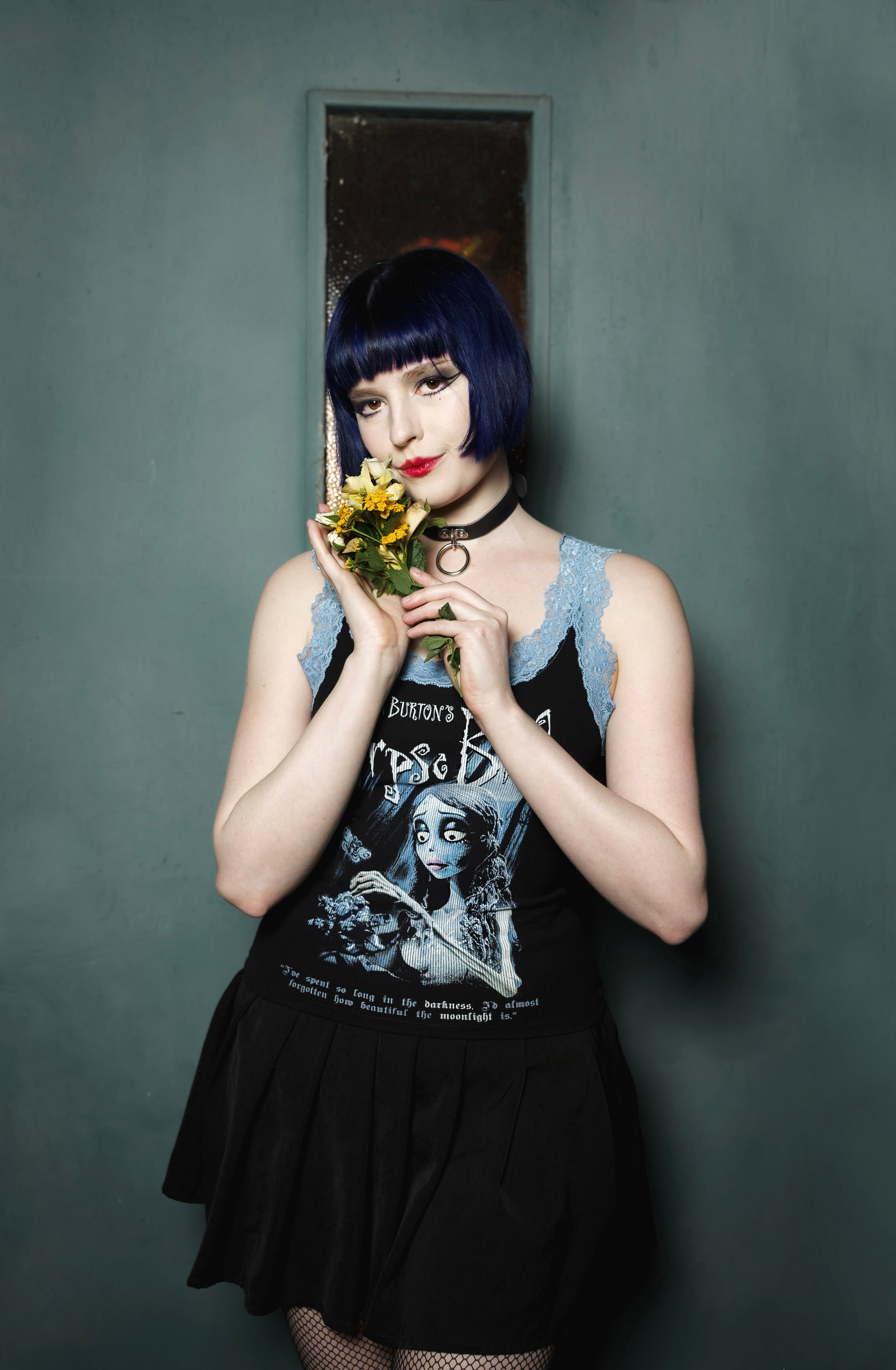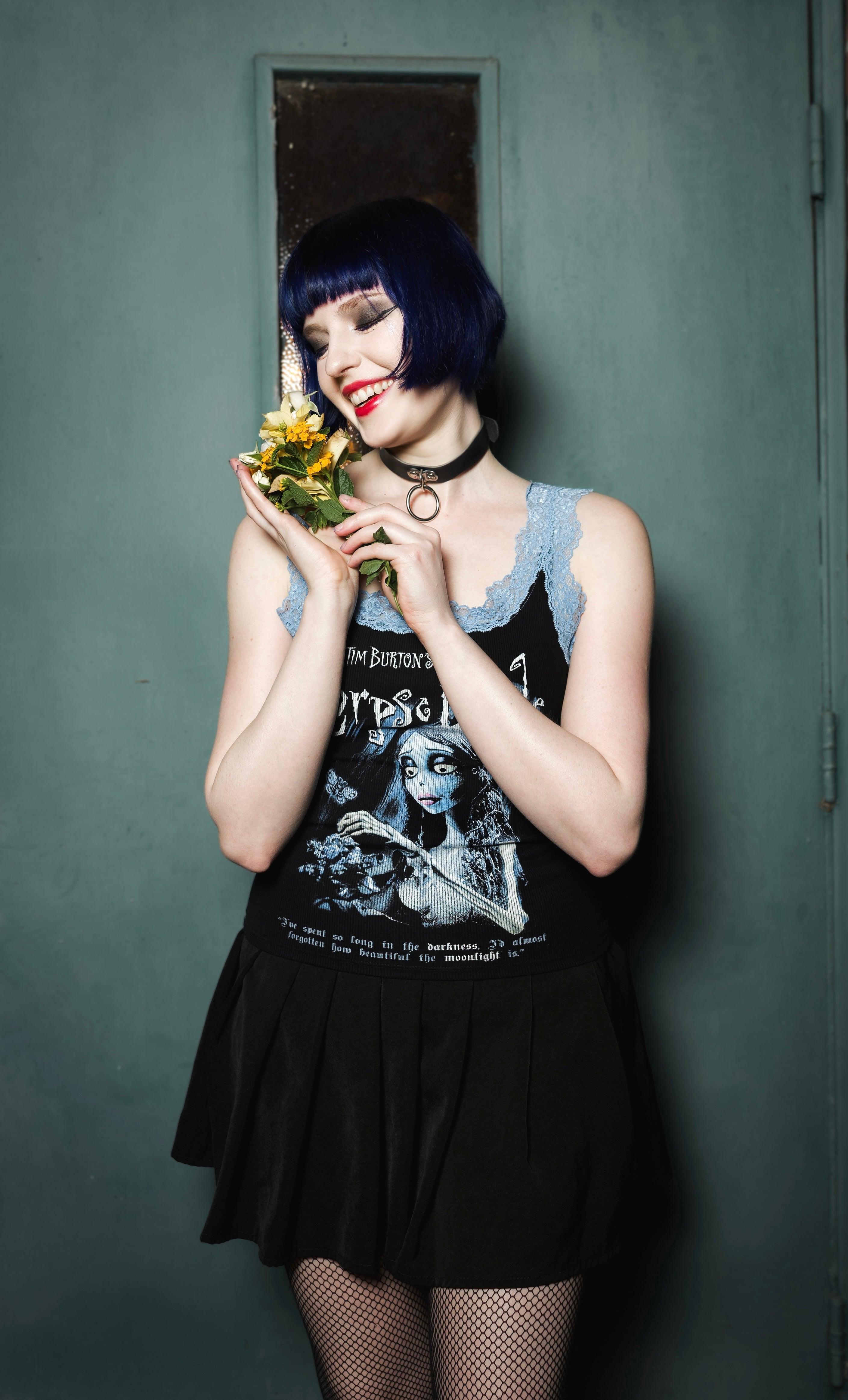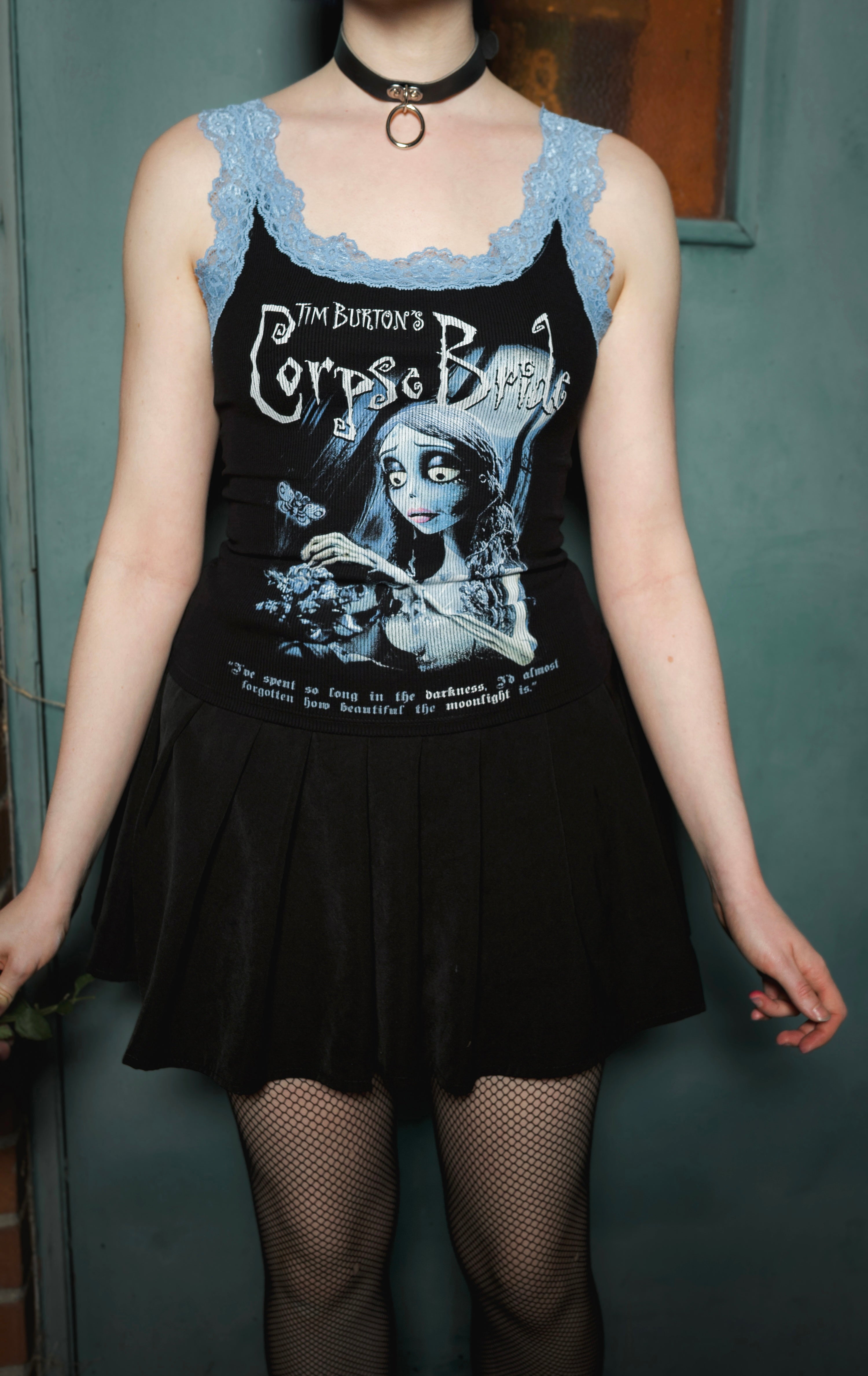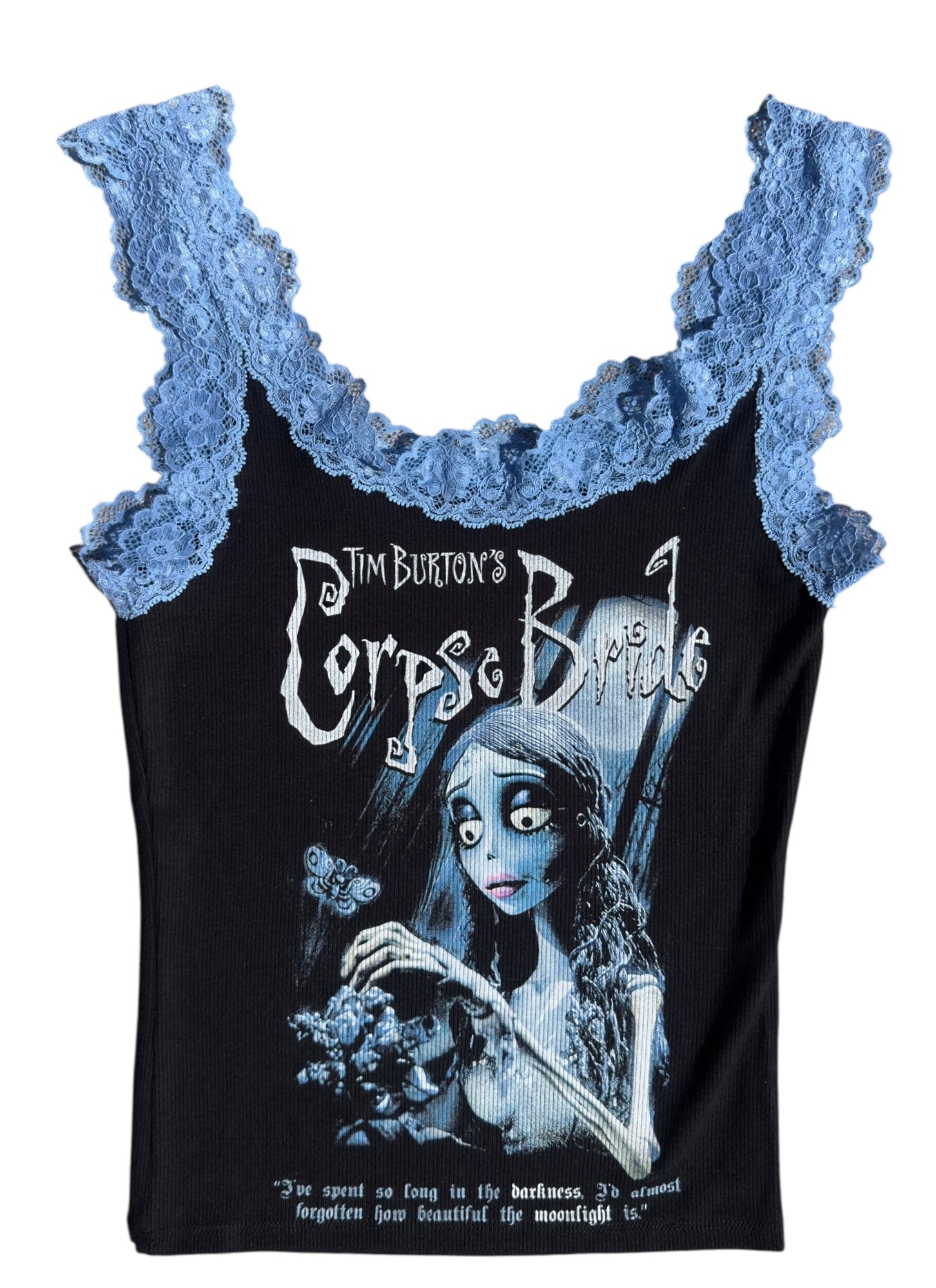 This tank top has a stretchy ribbed construction, light blue lace shoulder straps, and Corpse Bride graphic on the front. Professionally handmade by us in Los Angeles, CA. ...