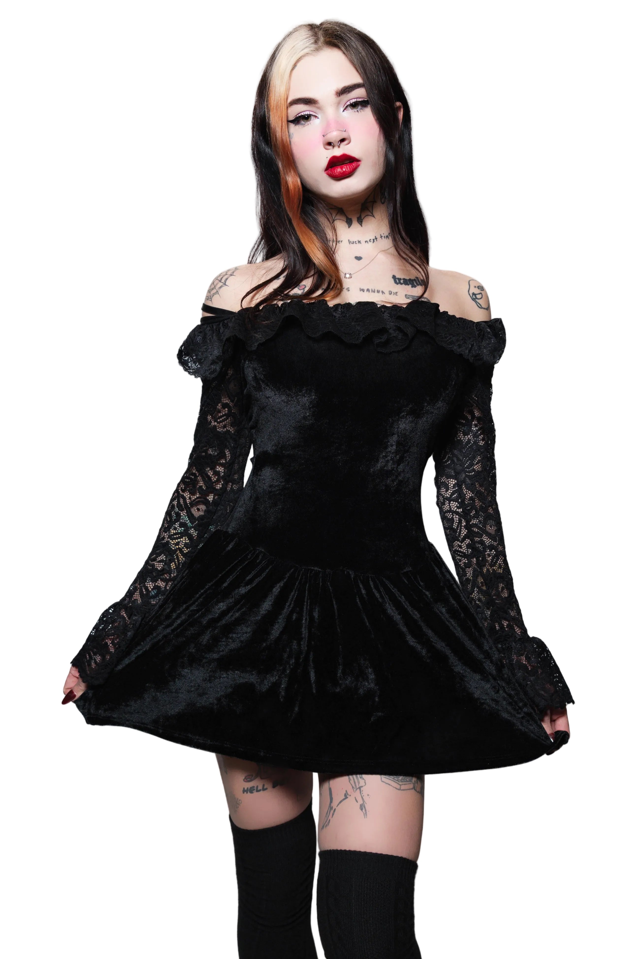 This velvet lace mini dress features a soft stretch velvet bodice with an off-the-shoulder lace-trim neckline and sheer lace long sleeves with flared cuffs, finished with a gathered velvet skirt...