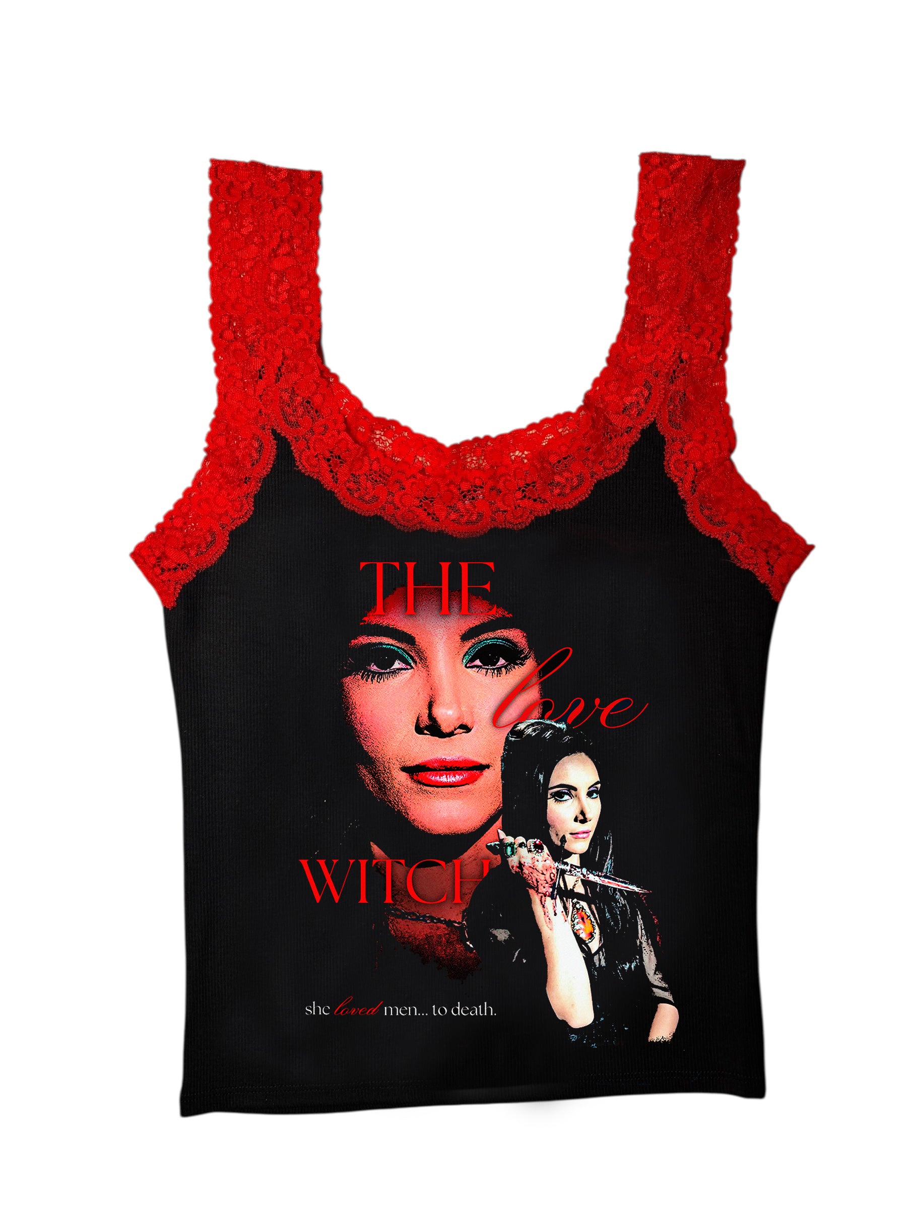 This tank top has a stretchy ribbed construction, red lace shoulder straps, and The Love Witch graphic on the front. Professionally handmade by us in Los Angeles, CA. ...