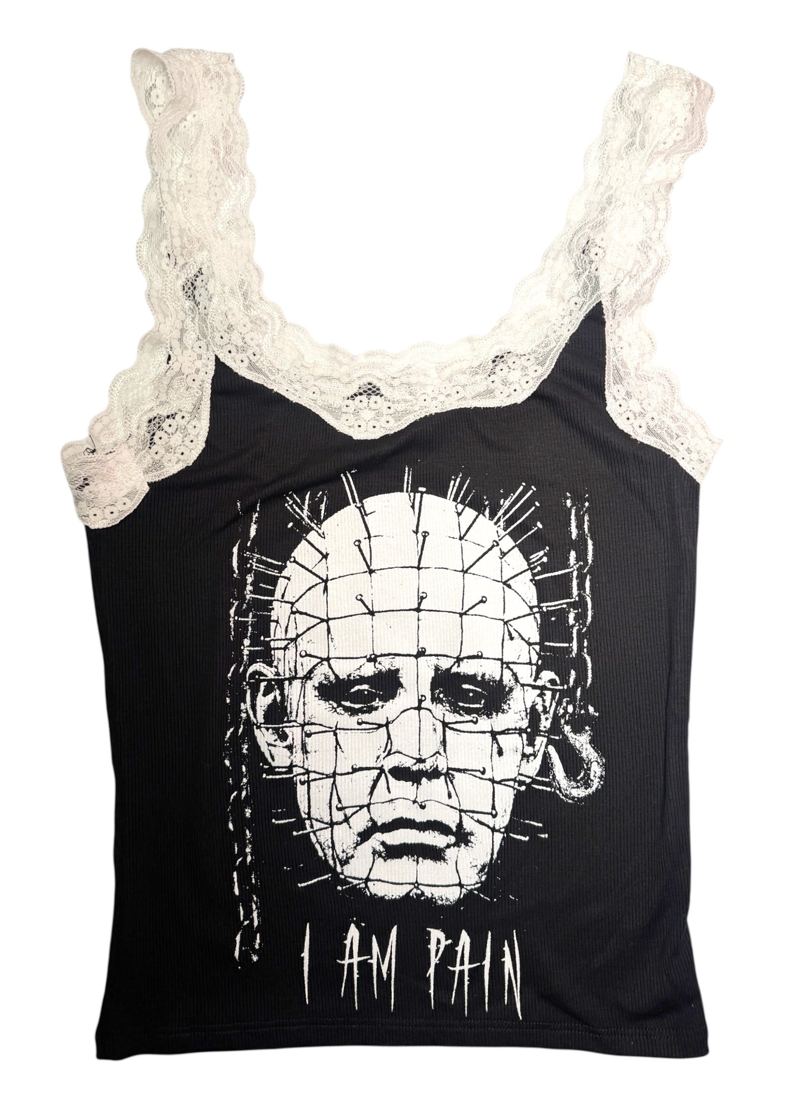 This tank top features a super-soft, stretchy ribbed construction, white lace shoulder straps, and an Pinhead graphic on the front. Professionally handmade by us in Los Angeles, CA. Sizes S-4XL...